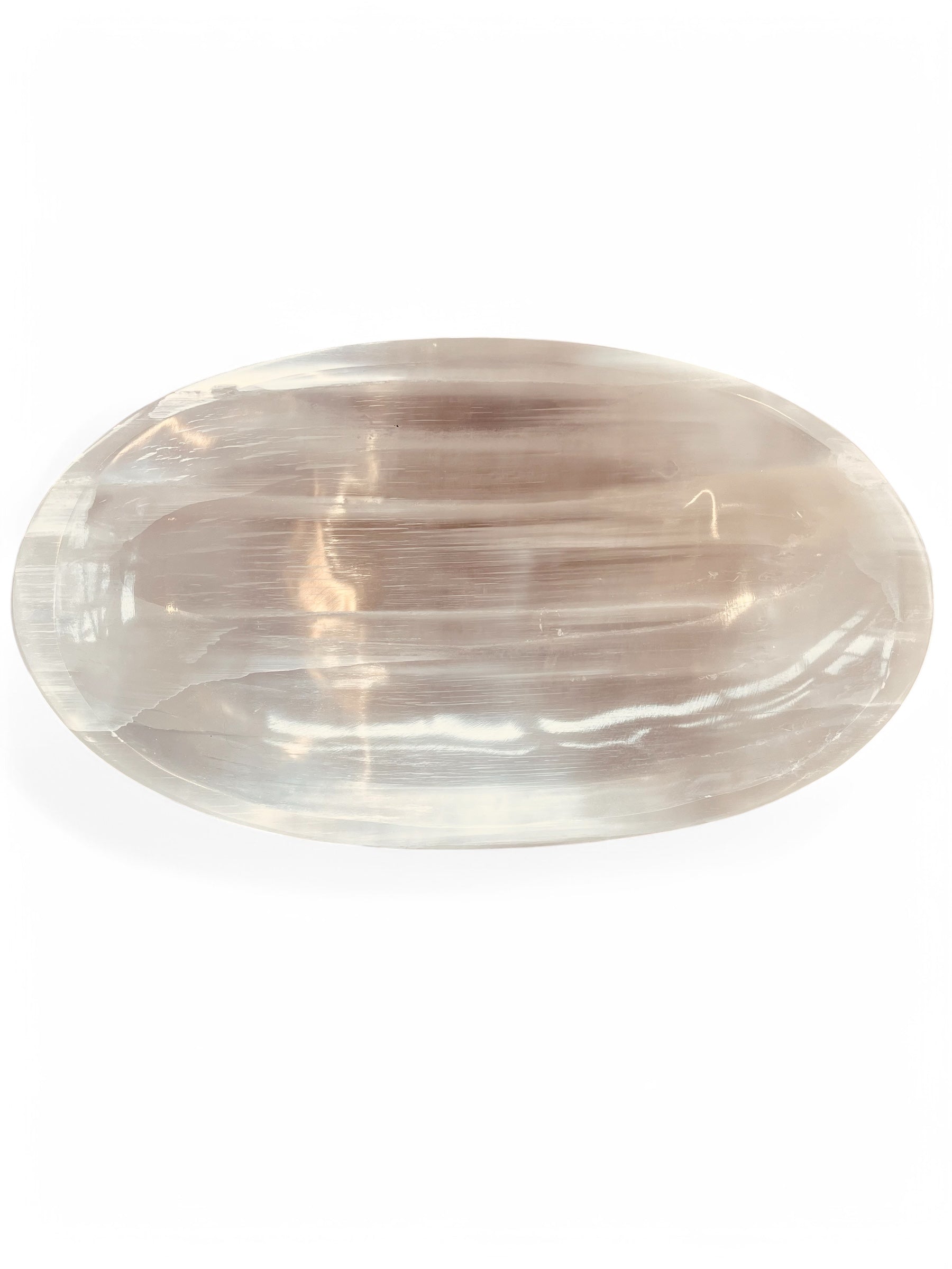 Carved from luminous satin-finish selenite, this Polished Selenite Bowl brings a touch of ethereal elegance to any setting. Its sleek, oval silhouette and pearly translucence make it a versatile styling piece—equally stunning when holding keepsakes or left beautifully empty.