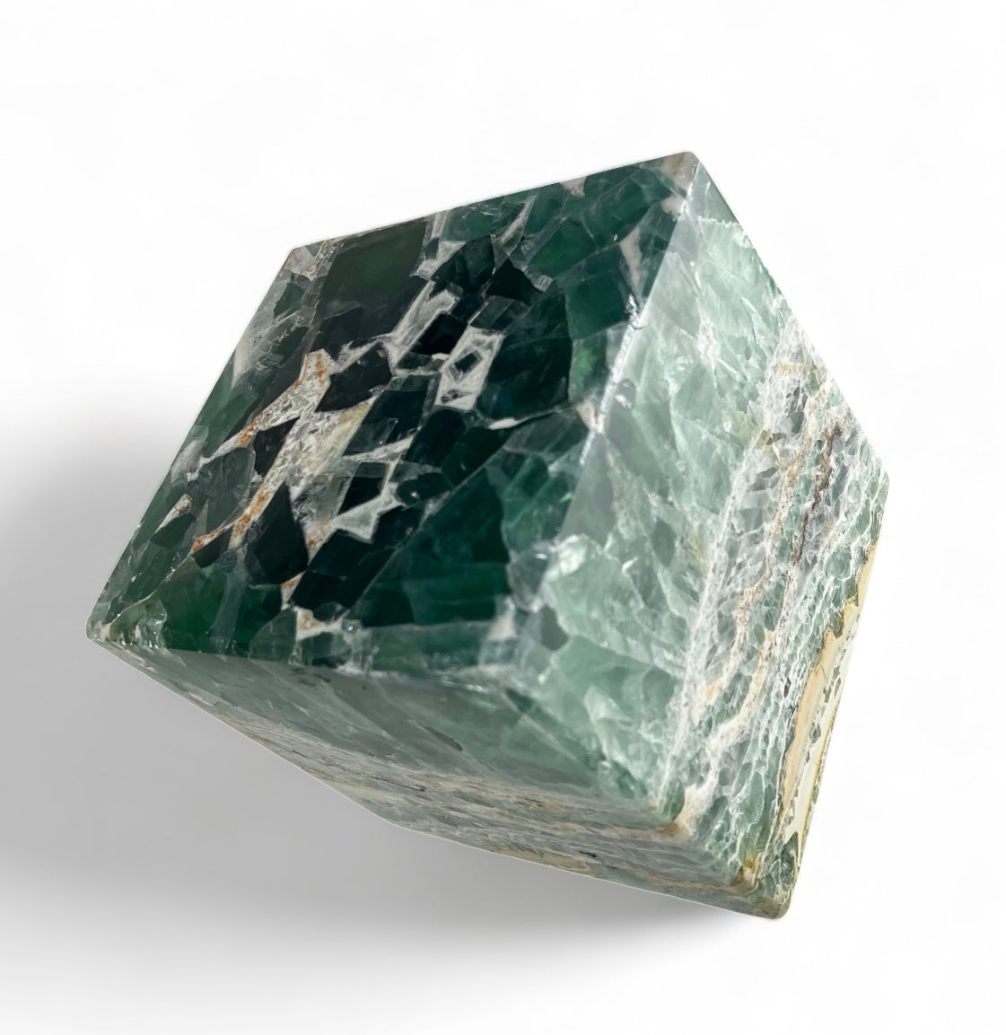 This mesmerizing Fluorite Cube is a geometric stunner—equal parts vibrant energy and artful design. With its kaleidoscope of purples, greens, and blues, it brings a refined, modern edge to shelves, desktops, and styled surfaces. Fluorite is known for promoting mental clarity and focus, but let’s be honest—this piece earns its place on looks alone.