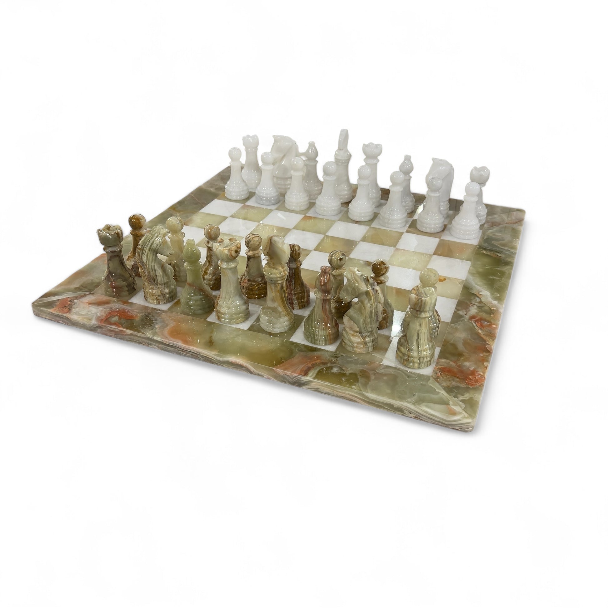 - Includes: Full set of carved Green Onyx chess pieces and board and carrying case.