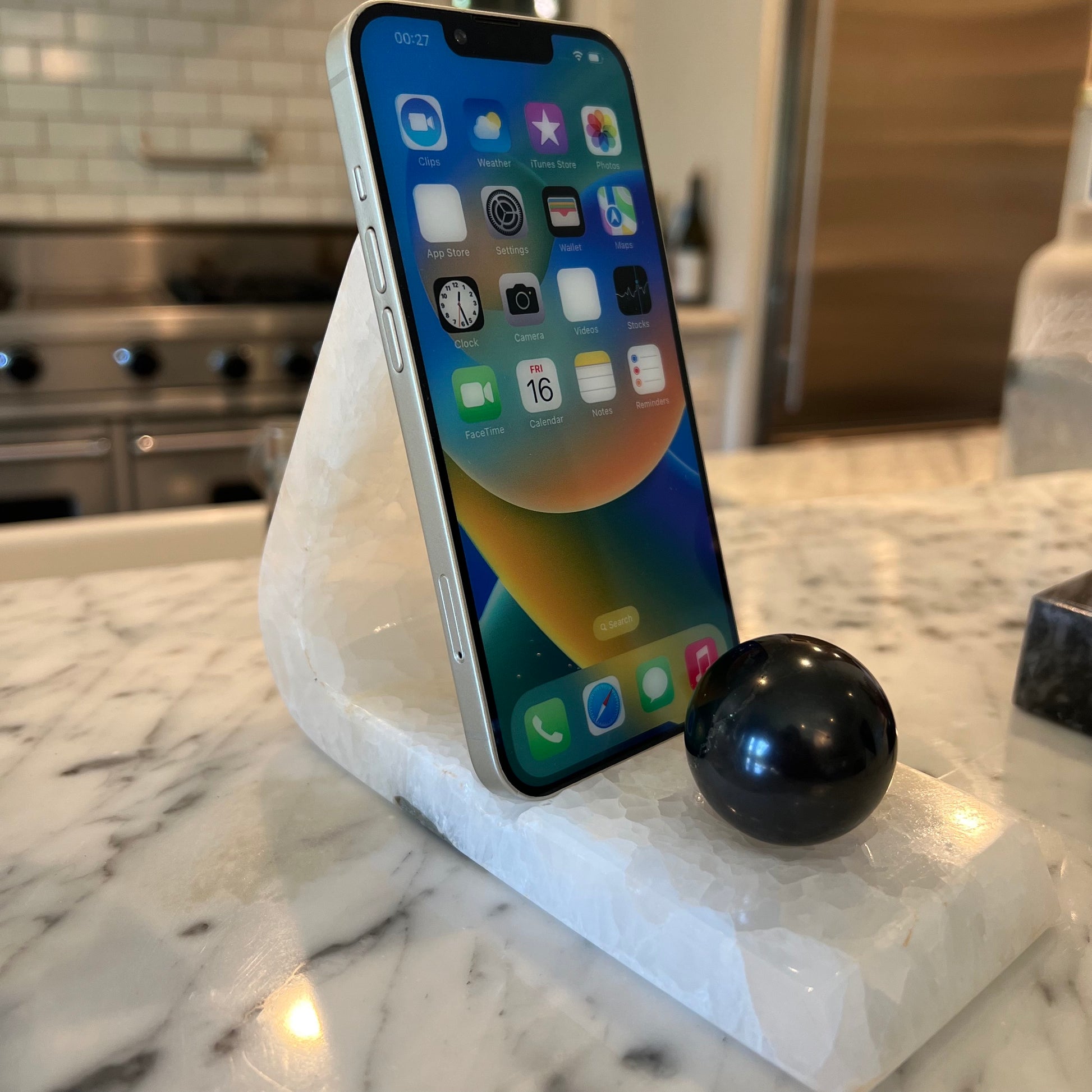 Form meets function in this sleek Onyx phone holder, paired with a polished Shungite sphere for an unexpected touch of sculptural elegance. Whether styled on your desk, nightstand, or entry console, this design-forward piece elevates everyday tech into a grounded decor moment. Carved from Mexican Onyx—long associated with strength and confidence—and paired with Shungite, a stone revered for its protective properties, it's both beautiful and intentional.