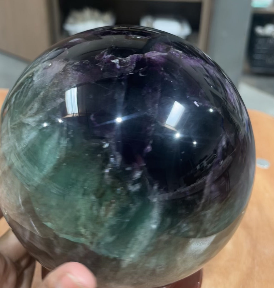 A true showpiece, this Rainbow Fluorite Sphere blends deep purples and vivid greens in stunning natural harmony. Polished to a glossy finish, the layered bands of color glow from within—making this a radiant focal point for any shelf, entry table, or sacred space.