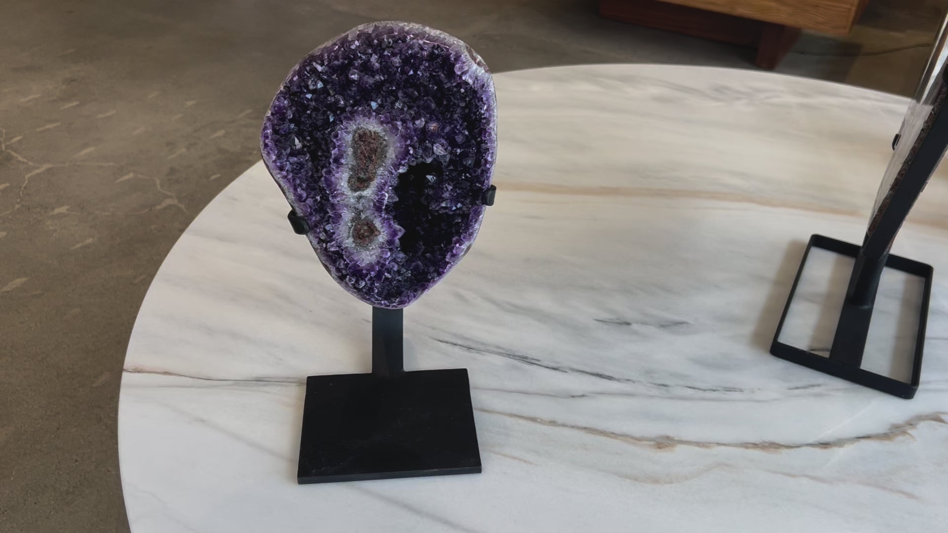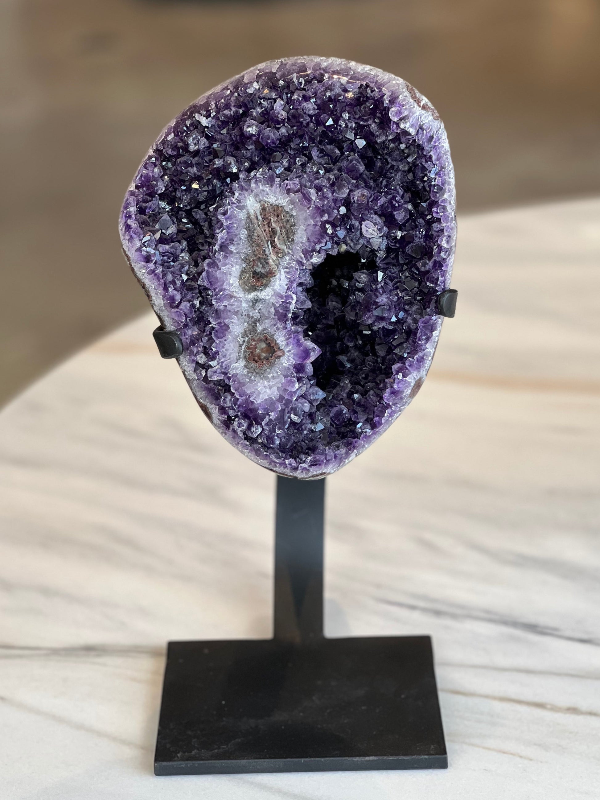 Mounted on a sleek custom stand, it adds a bold, sculptural element to console tables, entryways, or shelves. The deep plum tones and crystalline depth bring both visual drama and organic elegance into your space.