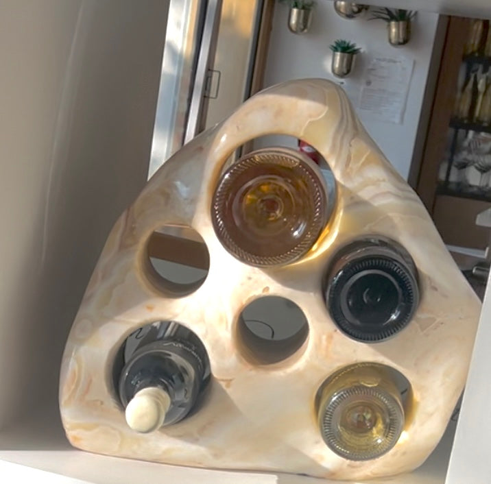 Sculptural and statement-worthy, this Zebra Onyx Wine Rack is a functional work of art. Hand-carved from natural zebra onyx—a striking fusion of quartz and morganite—its dramatic banding and substantial form make it a stunning addition to any luxury kitchen, wine cellar, or dining space.